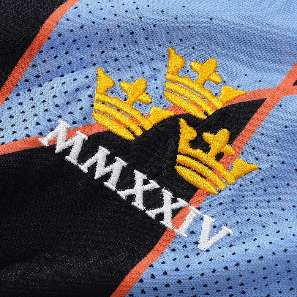 100% polyester jersey. All over digital print. Embroidery on front. Jacquard stripe collar with ribbed neck opening.
